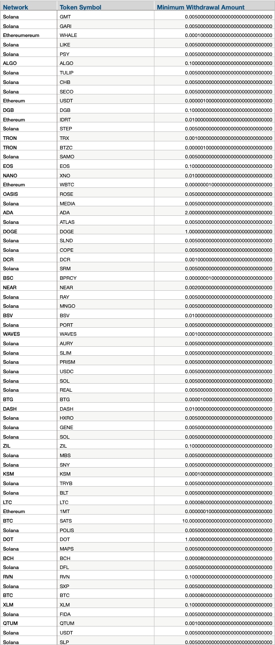 The following is a list of all the tokens with minimum withdrawal requirements and their minimum withdrawal amounts