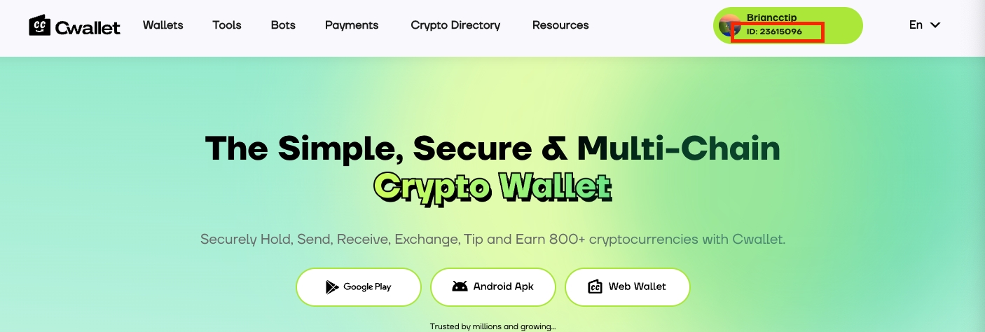 Visit the official Cwallet website. Your Account ID can be found in the upper right corner of the homepage.