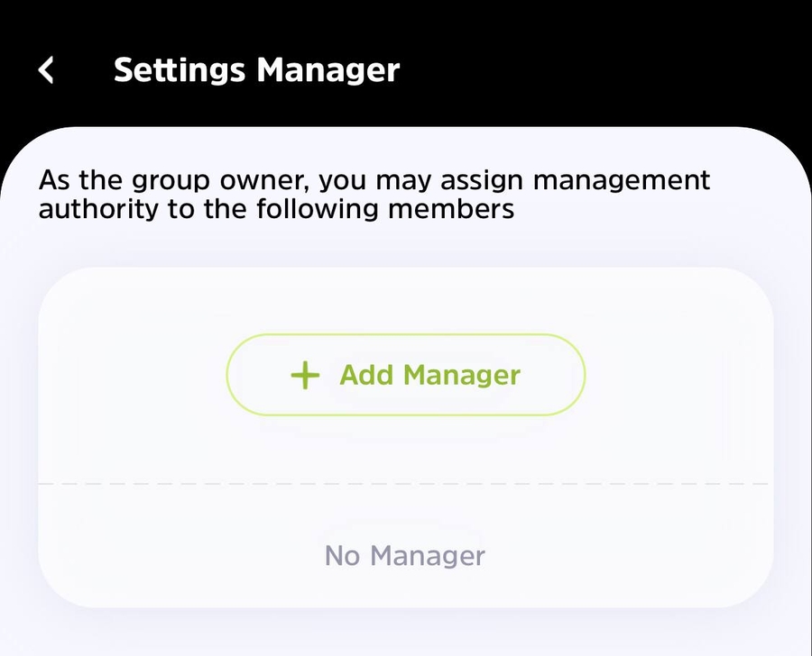Grant or cancel group setting permissions to a role by tapping the button + Add Manager.