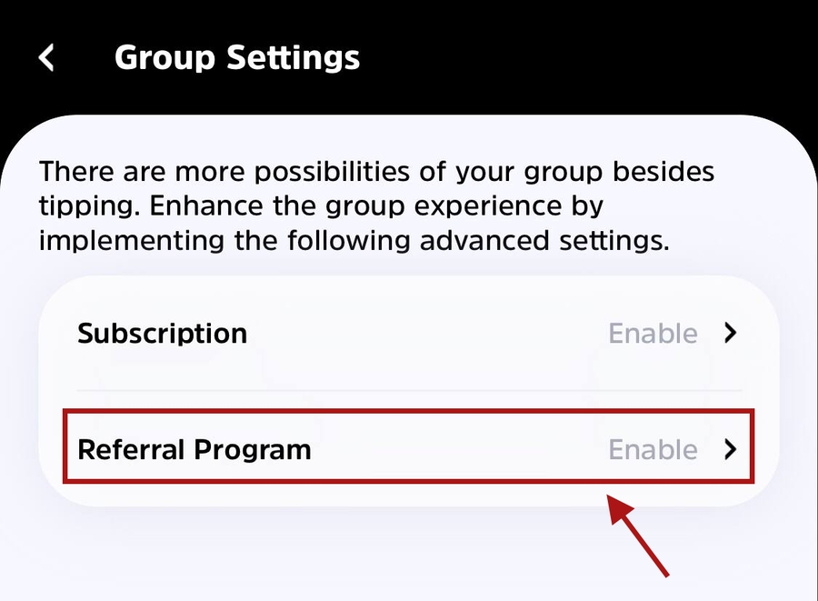 4. Select Referral Program. Enable the switch button.