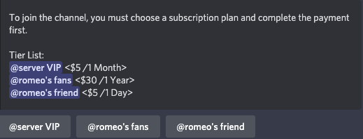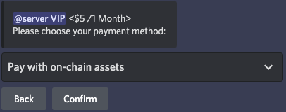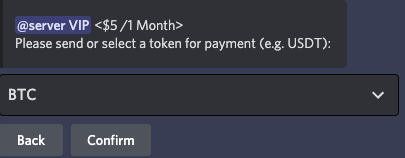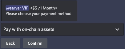 1. Visit Discord sever, send /buy role in a channel. When the bot responds with all subscribed roles, click the role button to proceed.