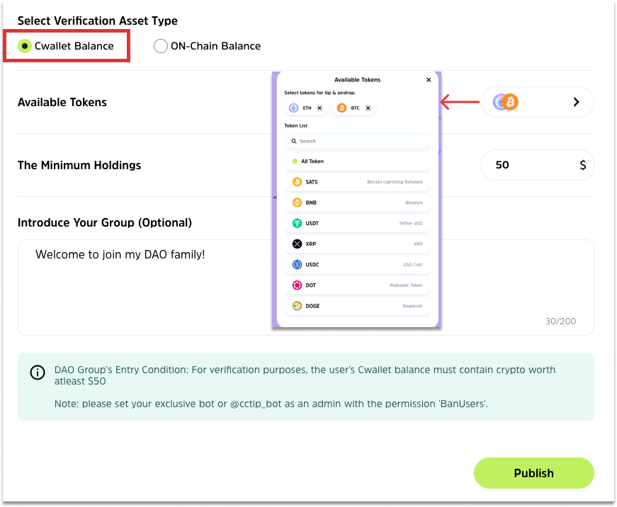 **Available Tokens:** You can select the tokens supported by Cwallet to be available for verification. It is possible to select a single token, a group of tokens, or all tokens.