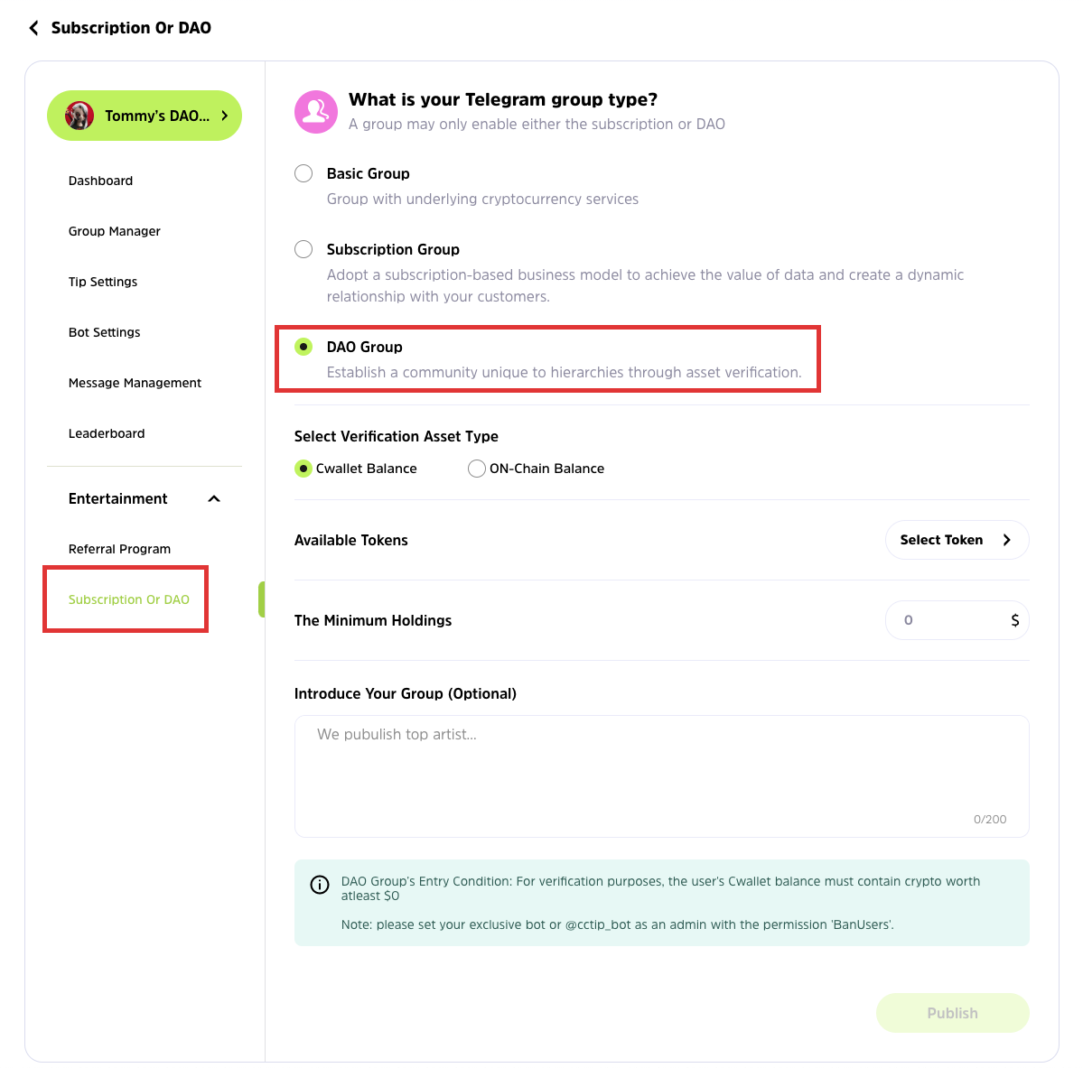 **6.** Once all the settings have been made, click **Publish** to save the changes. You will see the invitation link for your DAO group here. Share it and let other users join your group!
