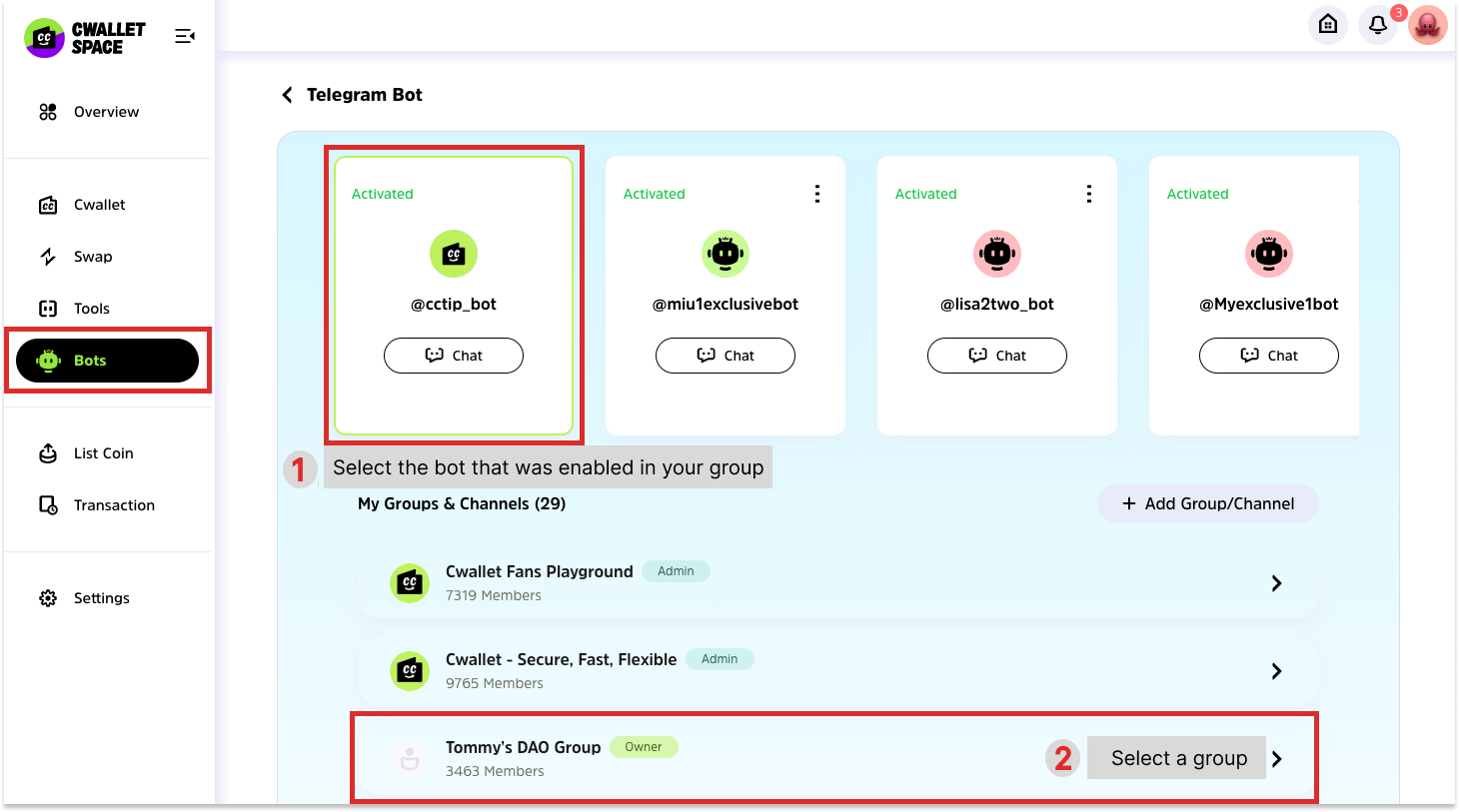**3.** Log in to [Cwallet](https://cwallet.com/) with your Telegram account and go to page **Bots** > **Telegram** **Bot.** Click the bot that you use in the group and click into the group from the list below to enter settings.<br>