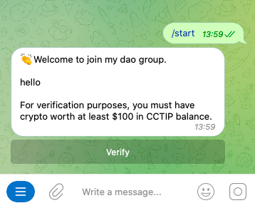 * <mark style="color:blue;">**How to verify Cwallet balance:**</mark> It is not necessary to connect your wallet, but please ensure your Cwallet account linked to your Telegram account has sufficient assets. To begin the verification process, click on **Verify.**&#x20;