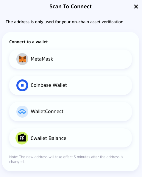 Choose and connect a crypto wallet to verify. If necessary, you may change wallet. \ <mark style="color:red;">**Note**</mark>**:** Connecting your crypto wallet will not affect your assets, it is only useful for verifying whether you hold a particular cryptocurrency/NFT on the blockchain.