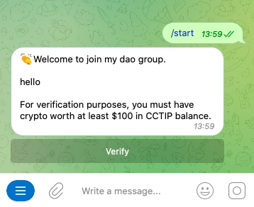 How to verify Cwallet balance: It is not necessary to connect your wallet, but please ensure your Cwallet account linked to your Telegram account has sufficient assets. To begin the verification process, click on Verify.