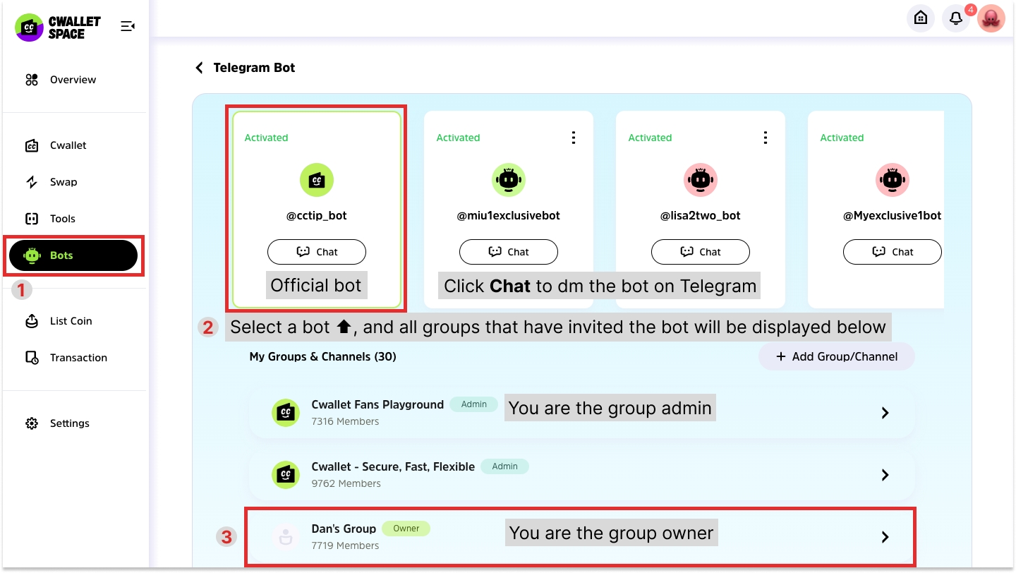 3. Log in to Cwallet with your Telegram account and go to page Bots > Telegram Bot. Click the bot that you use in the group and click into the group from the list below to enter settings