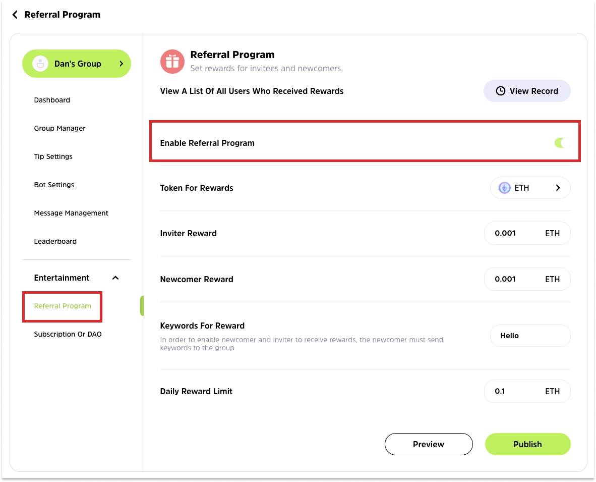 Keywords for Reward: Whenever a new member joins the group, the bot will prompt him/her to send this keyword to activate the reward, otherwise the referral reward will not be available for this inviter and newcomer.