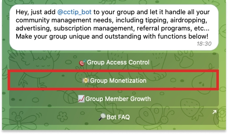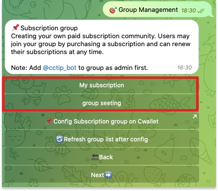 1. Dm @Cwallet_com_Bot or your exclusive bot, and click the button Group Management.