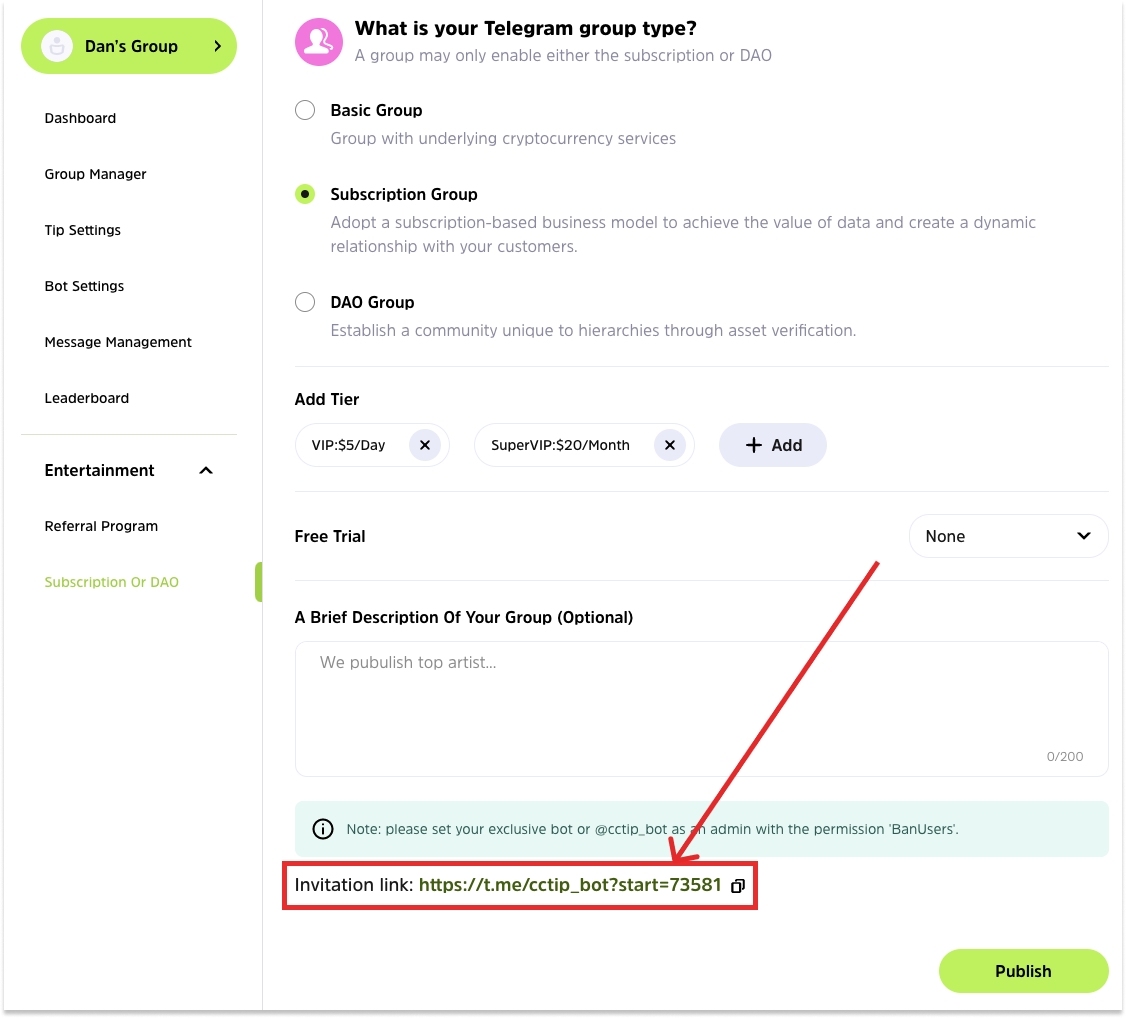 The invitation link for a Dao differs from the link for a group. If you are the owner or have permission to view group settings, you can find the invitation link for Dao on the following page.
