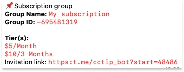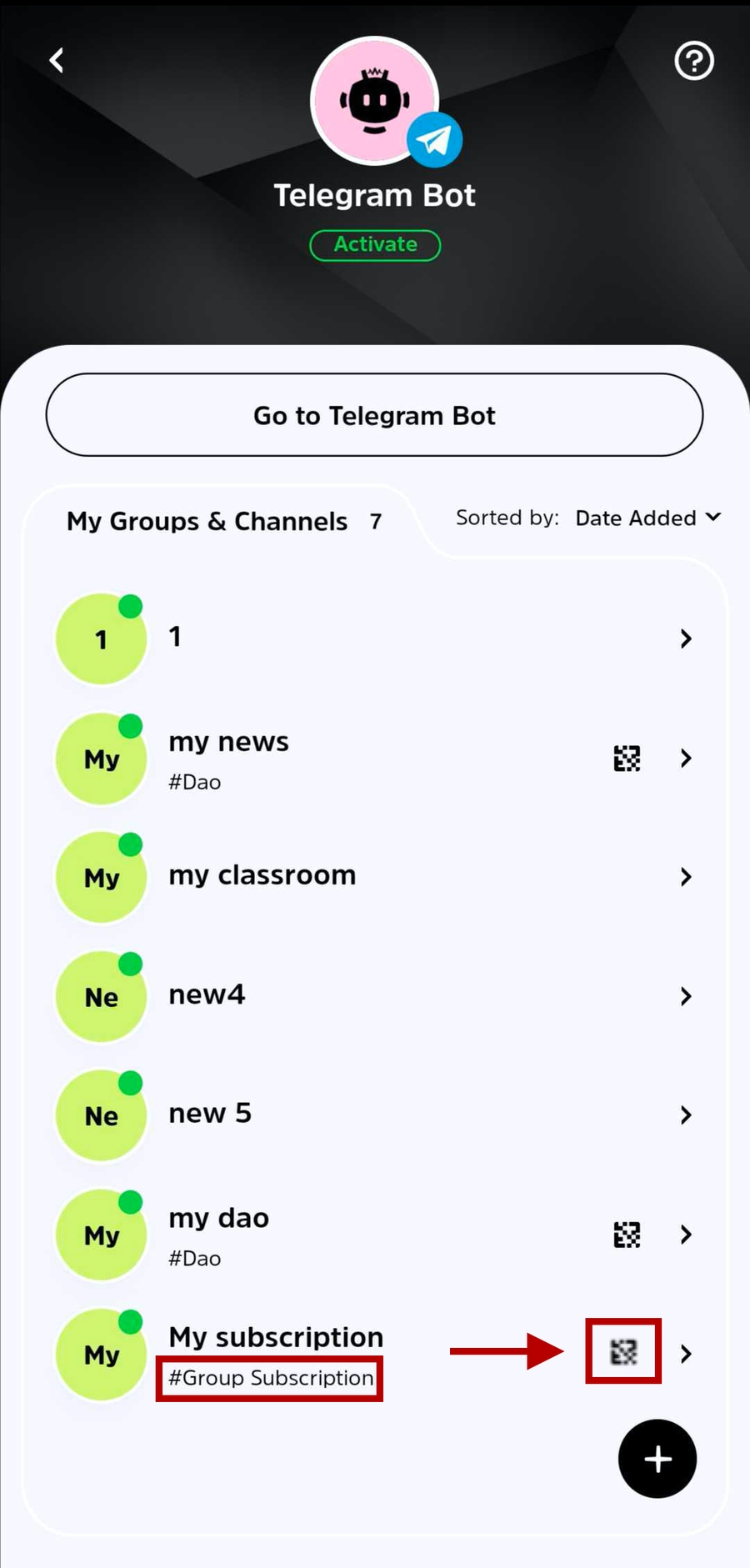 1. On the Telegram Bot page, tap the QR code on the right side of the group displayed as #Group Subscription to view the invitation link and the QR code Or you may tap on a subscription group to visit its settings page.