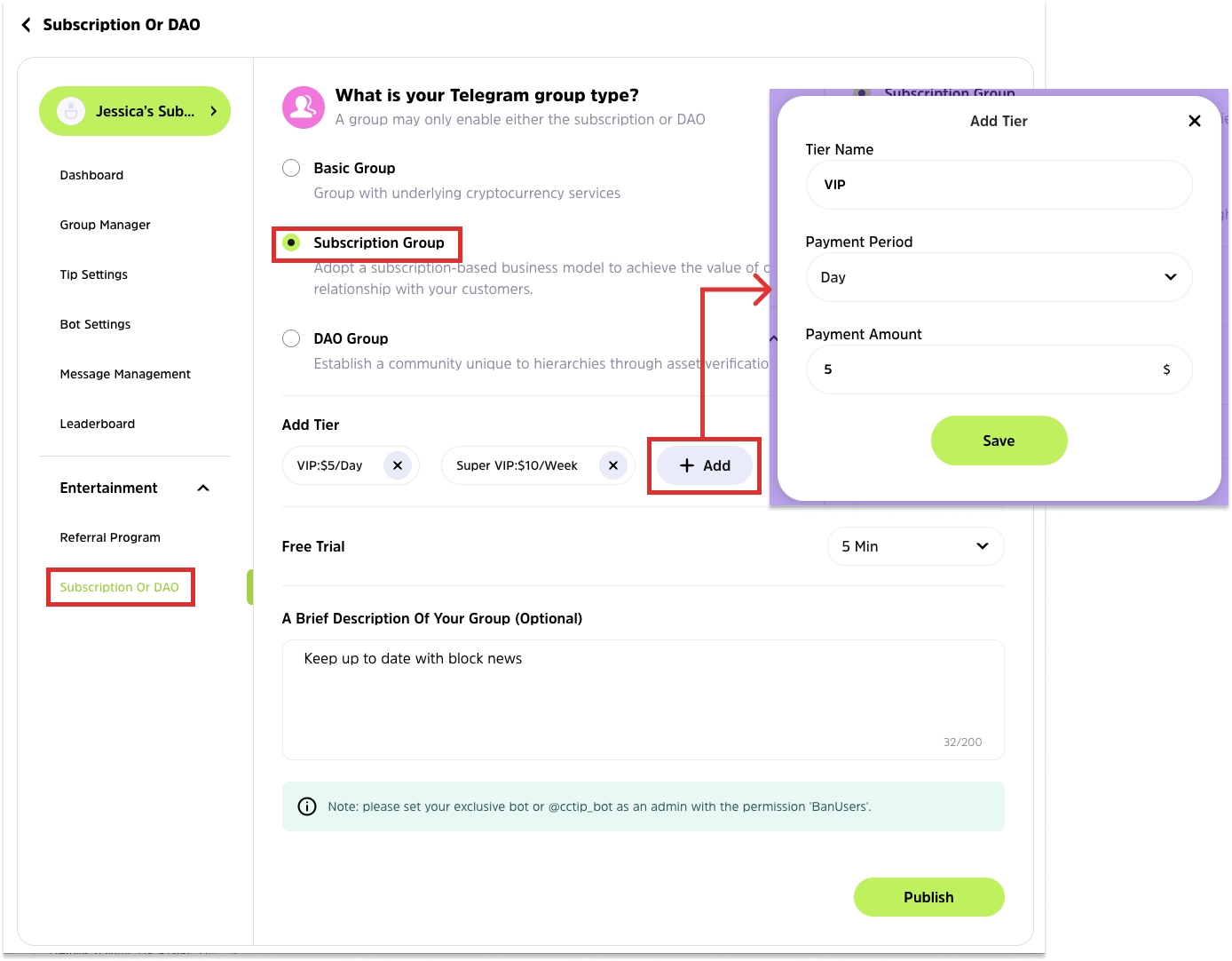 5. Click Publish to save the changes and get the invitation link of your subscription group.