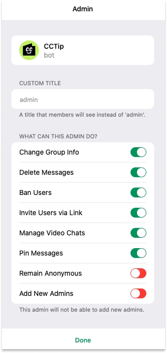 2. Promote the bot to group admin with all admin permissions except 'Remain Anonymous' and 'Add New Admins'.