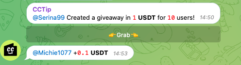 βπ How to send it: Here is an example, by sending the command: /giveaway 1 USDT 10 in a Telegram group, the first 10 people who click the button Grab will receive an equal share of the giveaway.