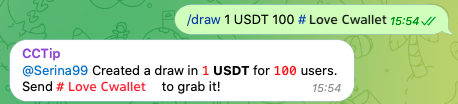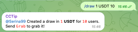 βπ How to send it: Here is an example, by sending a message with the command /draw 1 USDT 100 #I love CCTIP in a Telegram group, you would airdrop 1 USDT to 100 users. The first 100 users to send I love CCTIP will receive a random share of 1 USDT.