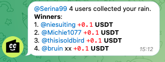 βπ How to send it: Here is an example, by sending a message with the command /rain 1 USDT 10 in a Telegram group, 10 most active users in that group will be randomly selected to receive an equal share of 1 USDT automatically.
