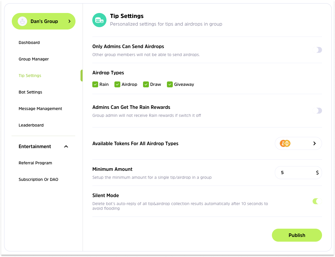 If you feel that there are too many bot messages about airdrop flooding on your group such as 'grab', you may turn on the Silent Mode to remove these messages in time.