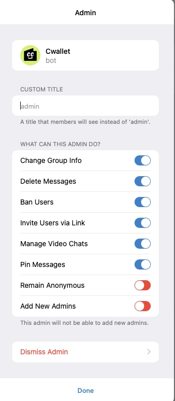 Now you are available to use Cwallet bot commands in the group such as /tip, /airdrop, etc. On your Telegram bot dashboard, you can also manage your groups/channels with multiple useful settings!