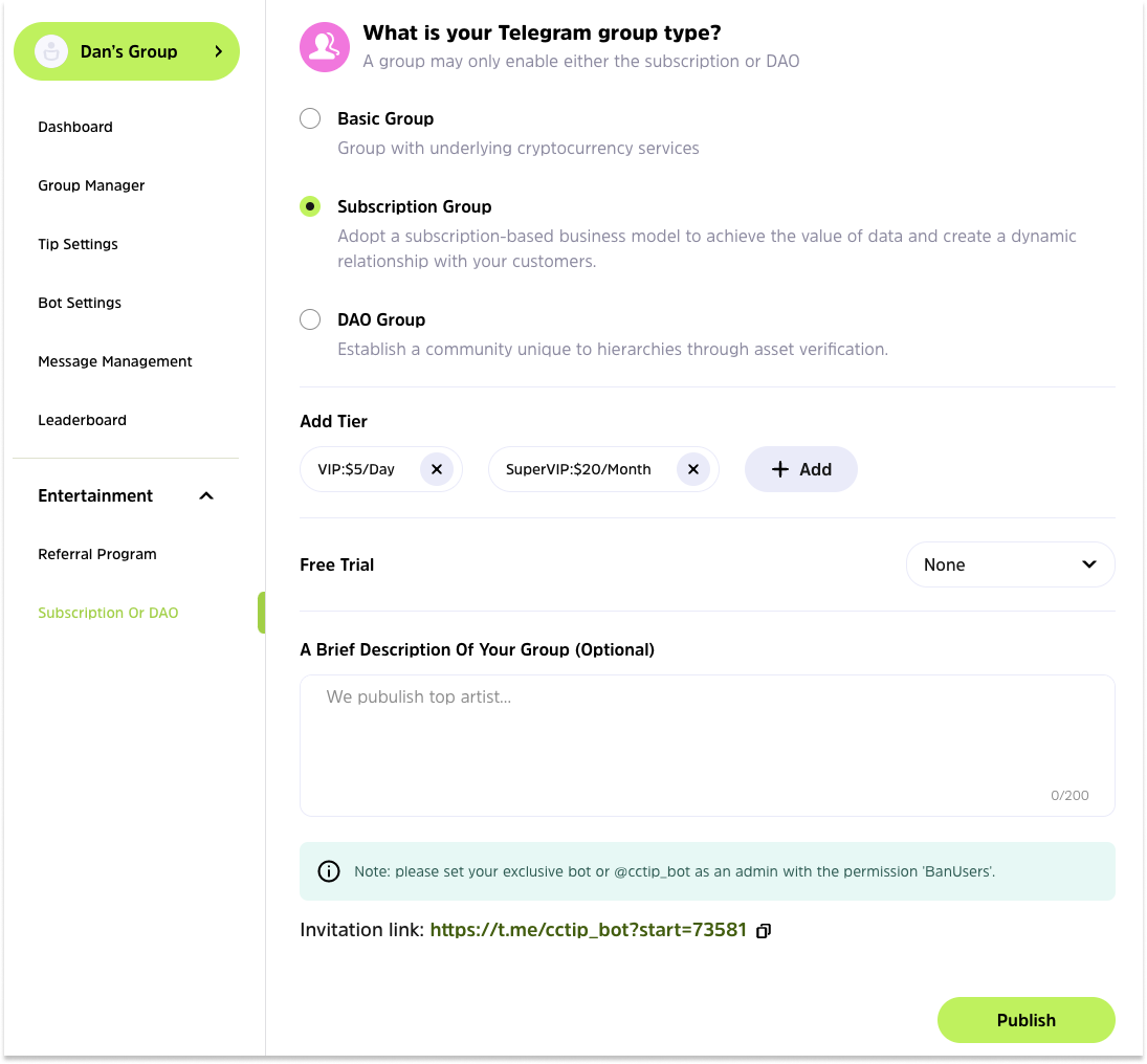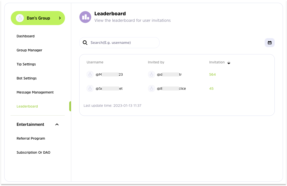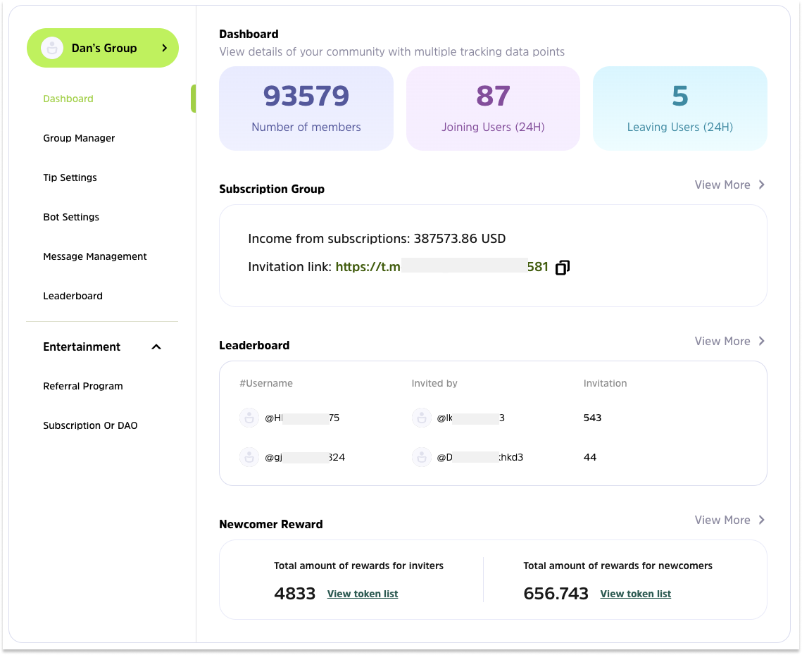 You will find an overview of your group: data of group member flow, subscription income, expenditures from referral program, and leaderboards about invitation.