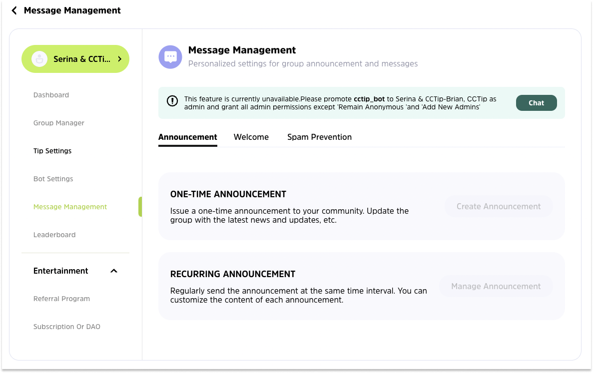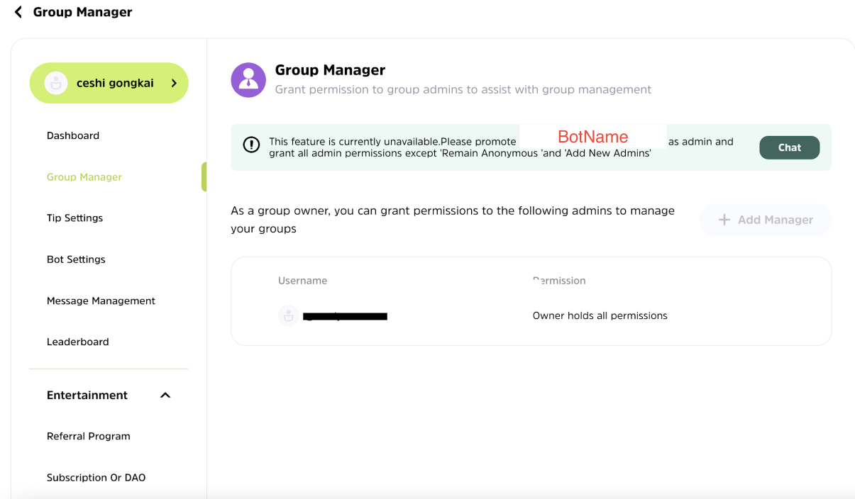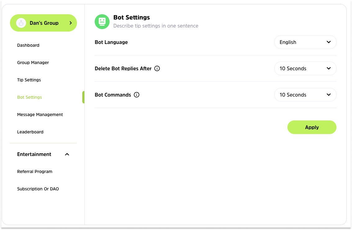 3. If you are the group admin and you invited the bot to group: You will be able to view the bot and group in your dashboard and you may modify Tip Settings and Message Settings. (If you are not granted more permissions by group owner)