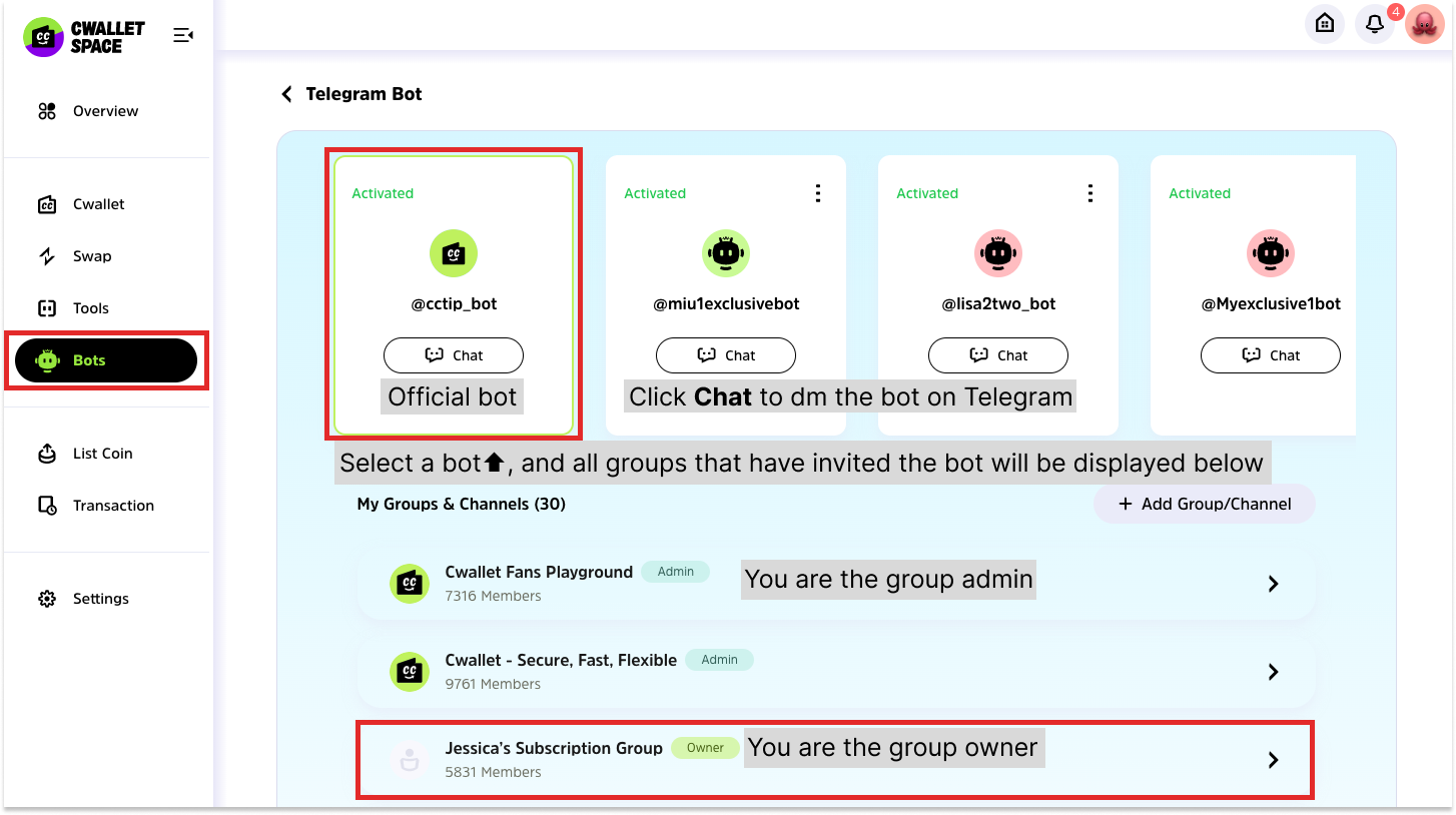 The Cwallet bot on Telegram allows you to manage your group and socialize with group members using simple commands and dashboard