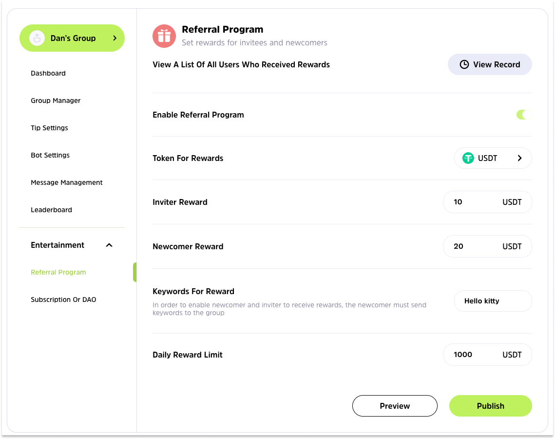 You can quickly grow your group by setting up referral rewards for inviters and invitees. Various reward methods are available, such as daily reward limit and keyword rewards.