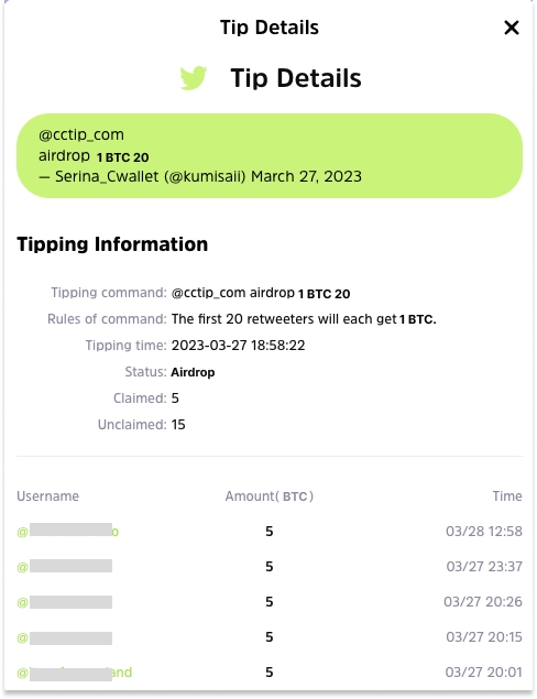 In Cwallet, you can view the history and details of the tips and airdrops you sent on Twitter