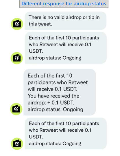 * **Received an airdrop successfully:** The bot will response with the rule of this airdrop, the airdrop status, and your collection details.