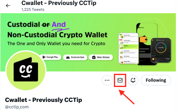 **3.** Go to the official Twitter account of Cwallet (**@cctip\_com**) and start a direct message.&#x20;