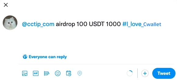 📌 How to create it: Here is an example, by sending a tweet containing the command @cctip_com airdrop 100 USDT 1000 #I_love_Cwallet, the first 100 users who Quote Tweet with the keyword I_love_Cwallet will receive an equal share of 100 USDT.