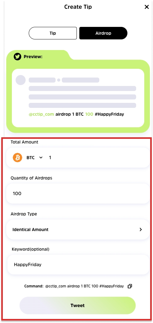 3. Select Airdrop and fill in the airdrop details. Click Tweet to send the tweet on Twitter to send this airdrop.