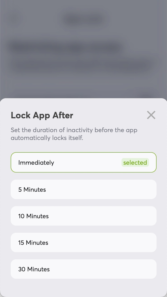 App Lock enhances your wallet security by automatically lock the screen of your wallet after entering the background with a flexible set of screen locking times.