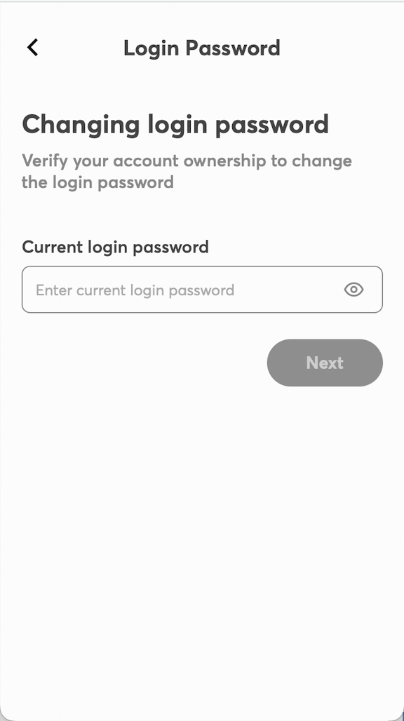 Enter your current password, then set and confirm your new password. Tap Next to complete the password update.