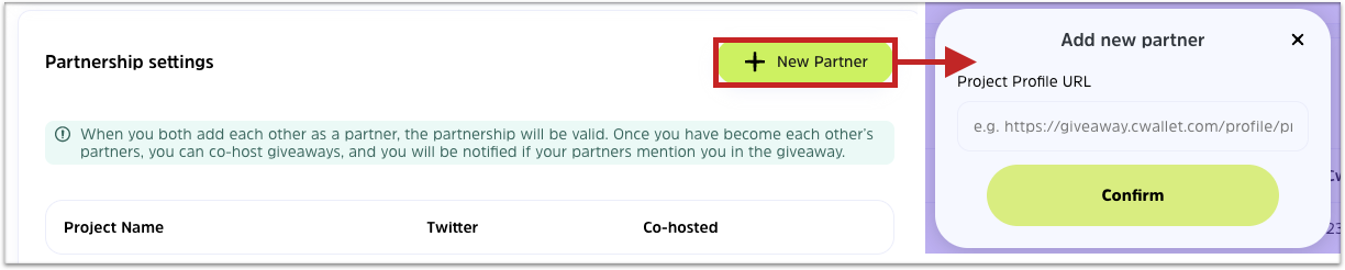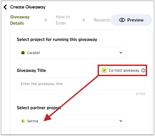 When you create a giveaway, enable **co-host giveaway** and select a partner. Your partner will be notified in his Cwallet notification.
