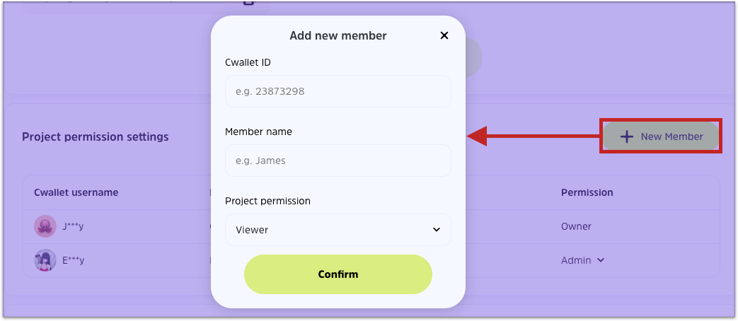 **2.** Enter his Cwallet ID, give admin a name and select the project permission.