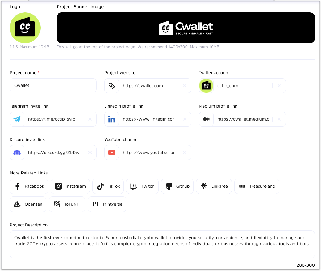 Your project profile includes information about your project, such as social media links, partnerships with other projects, giveaways you've hosted, and comments from participants.&#x20;