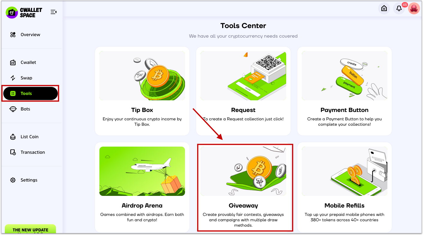 **1.** Log into your [**Cwallet**](https://cwallet.com/) account and click on the **Tools** page to enter **Giveaway**