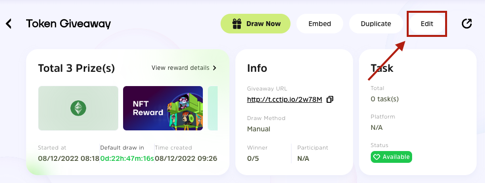 During the giveaway event process, if you would like to change, add or remove information such as description, banners, videos, rewards, etc., you may do so by clicking Edit in the giveaway dashboard.