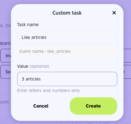To let participants know what the task is, choose one or more tasks and give them a name as a description. Single task: e.g. Choose Sign up as your website task and describe what you would like the user to do as the Task Name.