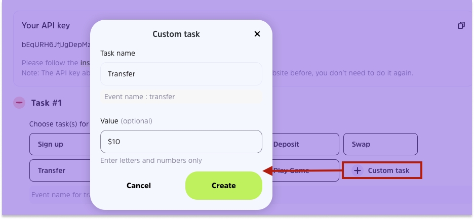 Select custom task, customize the task name, it is optional to specify the number of times/value, etc. Click Create to save your changes