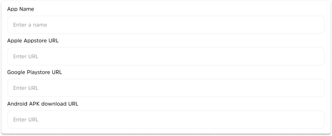 Input the name of your app, the download URLs for the Apple App Store and Google Play Store, and the Android APK URL.