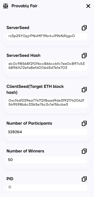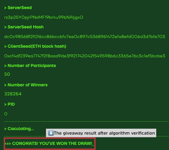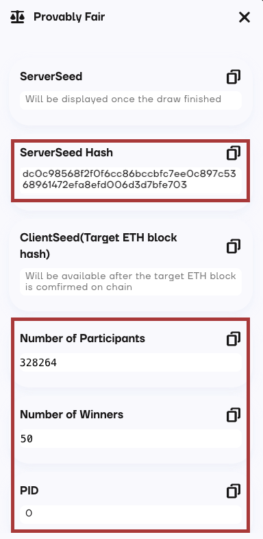 After the draw, you are able to view all following information which will be used for verifying the fairness by algorithm: ServerSeed, ServerSeed Hash, ClientSeed (Target ETH block hash), Number of Participants, Number of Winners and your PID.