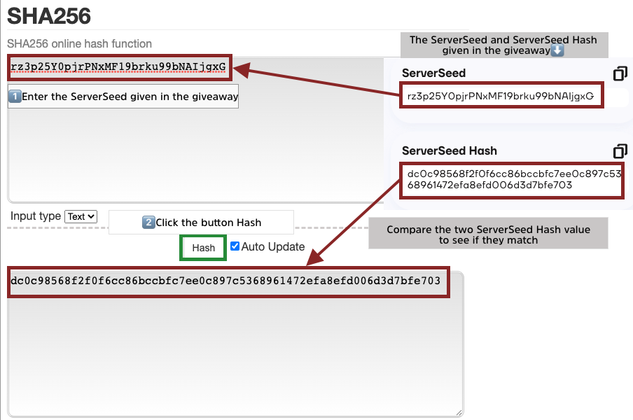 How to check the result: If the ServerSeed Hash you got in HmacSHA256 matches the one given in the giveaway (the values are the same)✅, it indicates that no tampering has occurred.