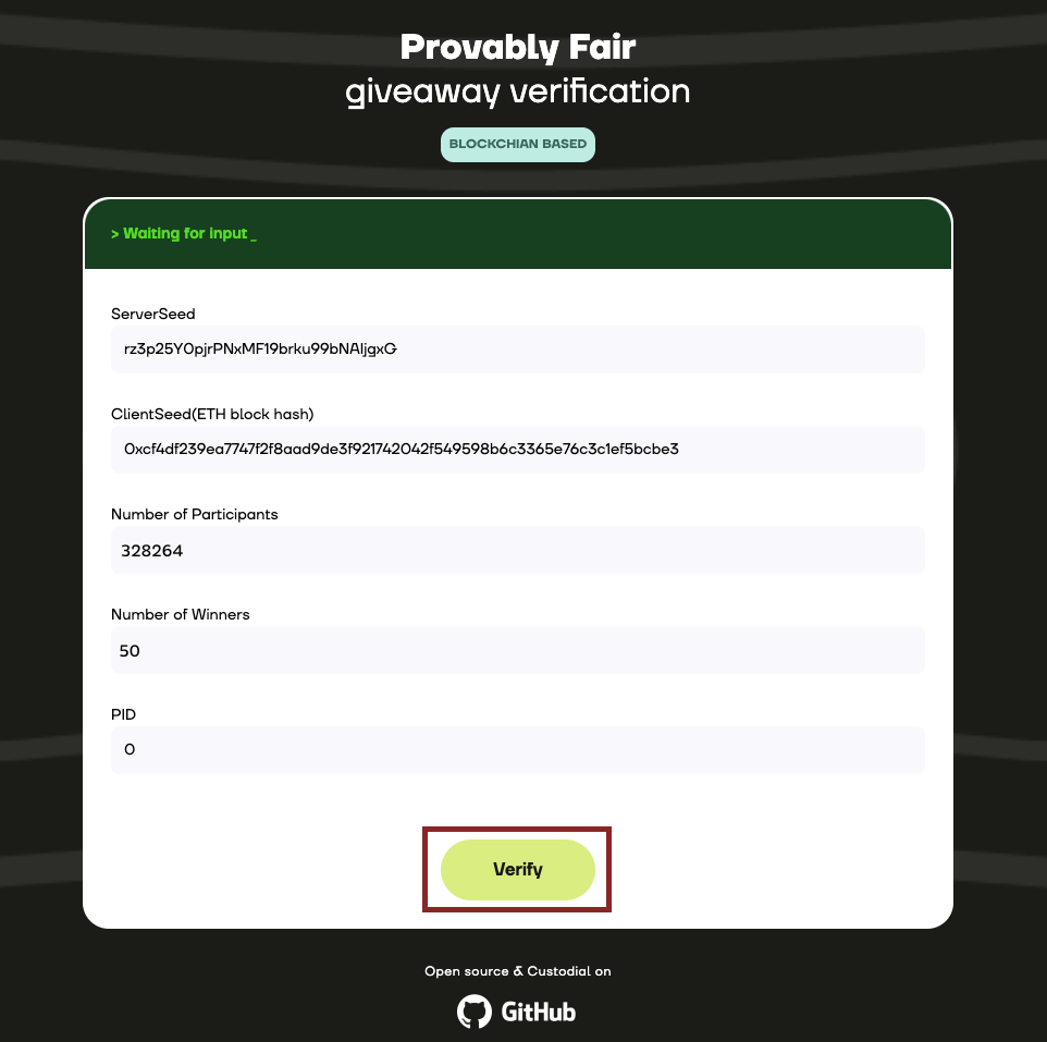 5. Now you enter the verification page. There is no need to change anything, click Verify again to begin verifying your giveaway results automatically by the algorithm.