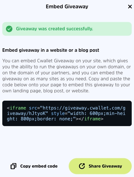 Once created, you will be able to embed this giveaway on your website as a developer using the code provided.