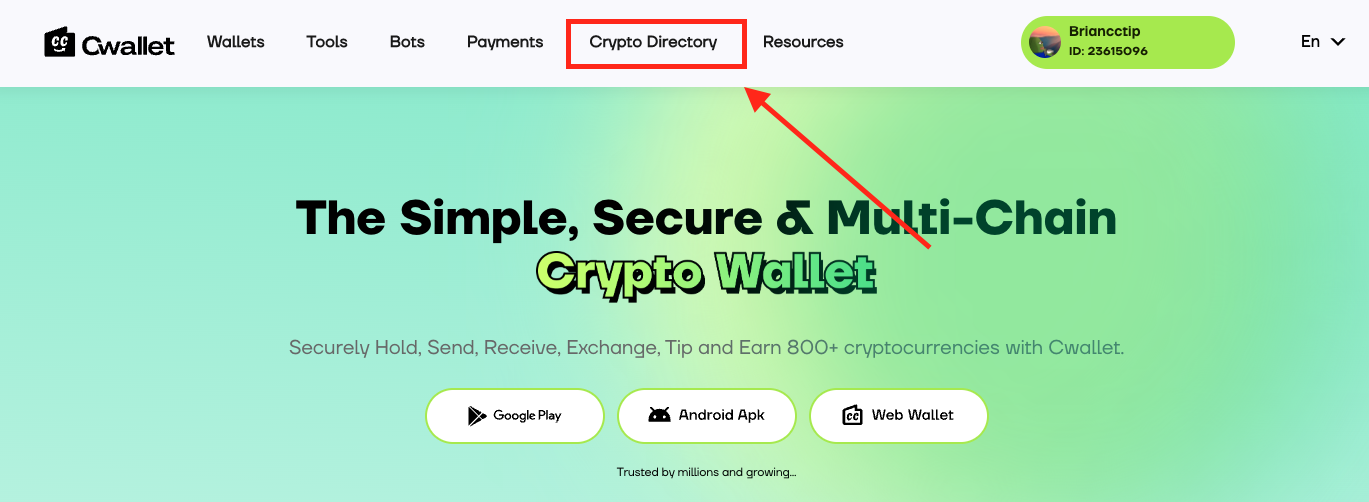 **1.** Visit [Cwallet](https://cwallet.com/) on the web page. Find **Crypto Directory.**&#x20;