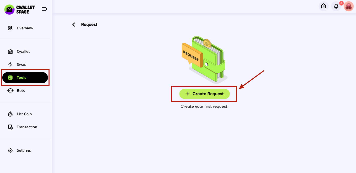 **1.** Log in to [Cwallet](https://cwallet.com/), navigate to **Tools**, select **Request**, click **+Create Request** to start creating.