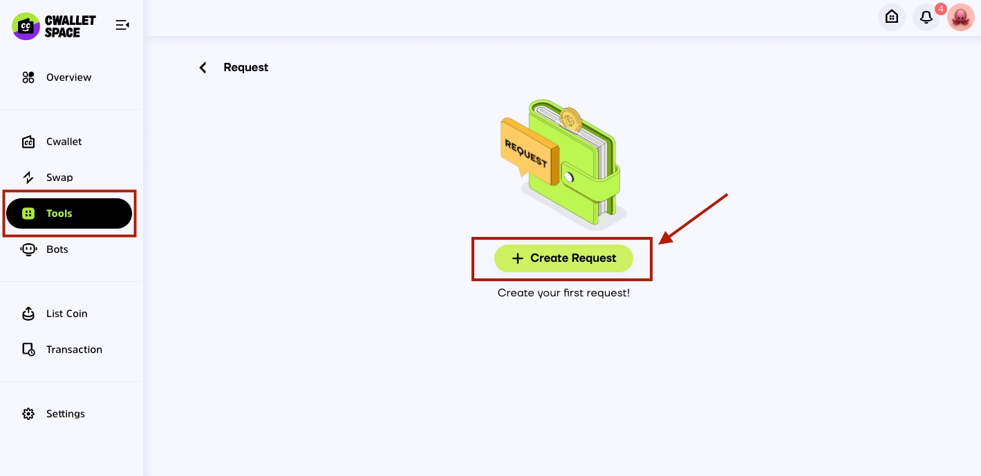 1. Log in to Cwallet, navigate to Tools, select Request, click +Create Request to start creating.