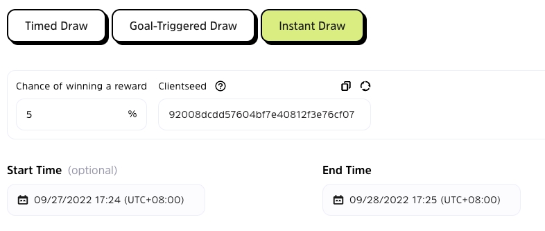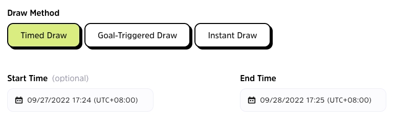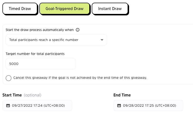 Each draw method has the option of setting the start time and end time, as well as allowing the creator to end the giveaway in advance.